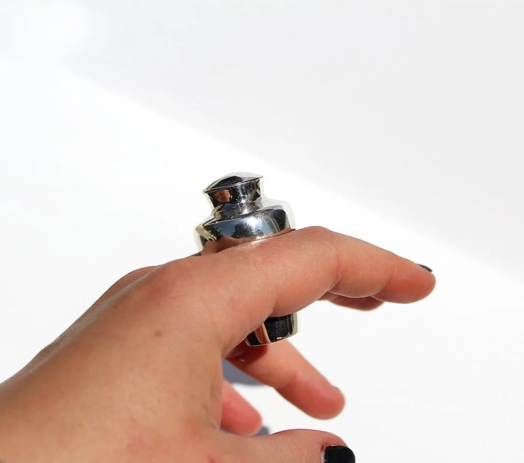 In this piece, I use the urn as an abstraction of the body. I was thinking further about how much of a burden our physical forms can be and how they can negatively impact our lives, yet how, without them, we could not exist. Our bodies hold many things: pain, love, our brain, our organs- we are vessels. The body completes the form of the urn, featuring a double ring design that holds the wearer inside. The piece acts as a functional container with a removable lid.
